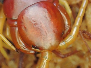 ほぼ日本全国に分布し生息数も多いと思われます。メナシムカデ科に属し体長は5~6cm程度と小型で気性はさほど荒くありません。体色は頭部、胴部ともに赤褐色、脚は黄褐色をして皮膚表面に細かいエンボスがあります。